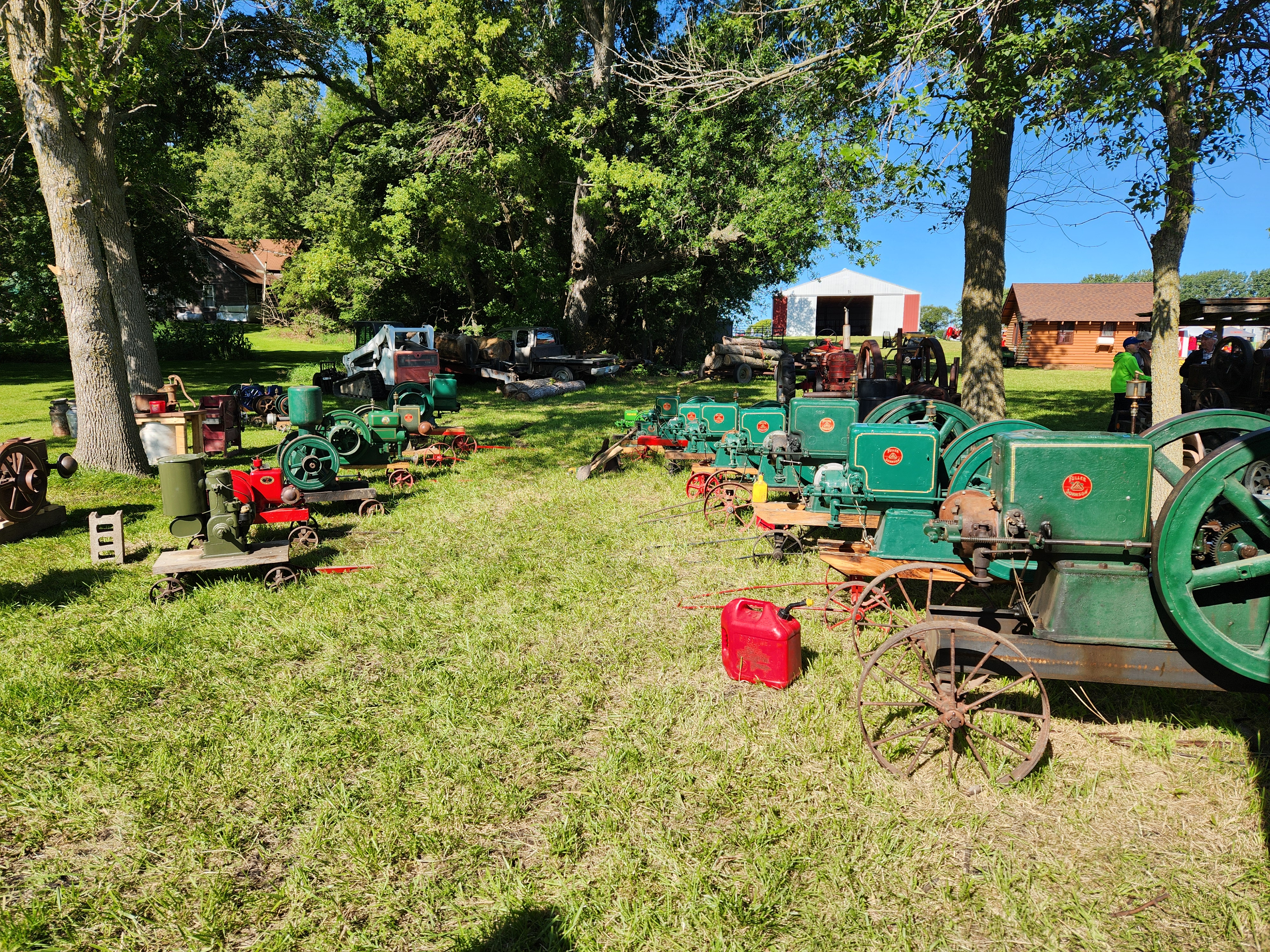 This image displays a large part of my engine collection. To the right is my lineup of Fuller and Johnson model Ns. In my lineup, I have the 1 1/2, 2 1/2, 3, 4, 5, 6, 7, and 9 horsepower engines. The 1 1/2 horsepower fuller and johnson shipped at 265 pounds, and the 9 horse shipped at 1530 pounds without a cart. The 6 horsepower engine is a "People's Price" engine which was the precursor to the N series. Less than 1000 of these "People's Price" engines were made. To complete my lineup, I need the 8, 10, and 12 horsepower model N engines. Pictured to the left are some of my other engines - DeLaval horizontal and upright engines, a Fairbanks Morse dishpan, a 4 horsepower Novo upright, a 3 horsepower Hercules, and a 3 horsepower Fuller and Johnson model K. Also pictured to the left is a 3 horsepower Fuller and Johnson model DE engine. This engine was built in 1912 and was a series that came before the model N.